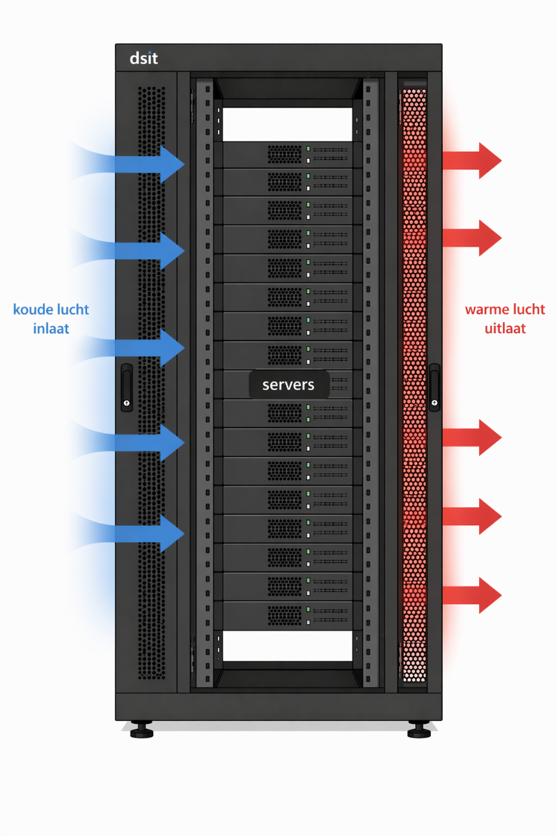 Een serverkast is ontworpen om warmte gestructureerd af te voeren. De geperforeerde deuren voor en achter zorgen voor een luchtstroom pad: koude lucht wordt aan de voorzijde aangezogen, stroomt langs de apparatuur en verlaat de kast via de geperforeerde achterdeur. Dit principe, koud gangpad aan de voorzijde, warm gangpad aan de achterzijde, is de basis van elk goed warmtemanagement, van een enkele kast tot een volledig datacenter.